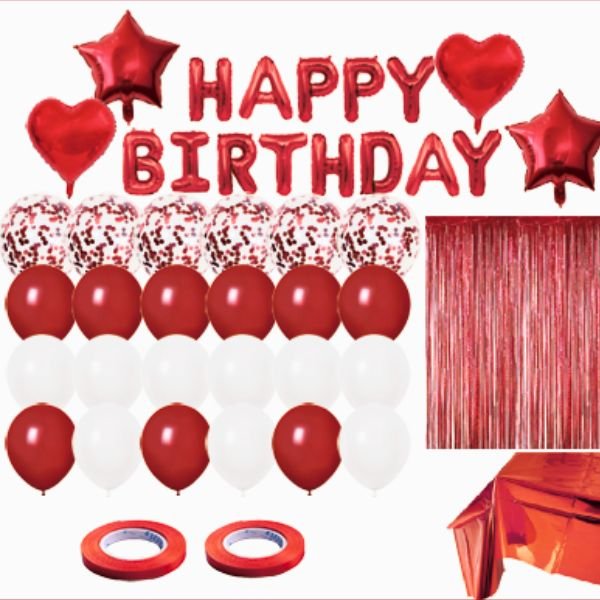 45 Pcs | Birthday Decoration Set, Happy Birthday Letter, Heart, Star Balloons, Foil Tablecloth & Curtains for Birthday Party Decoration – Red
