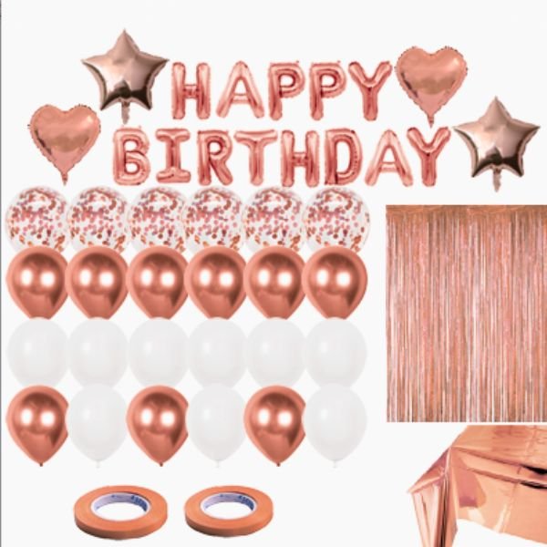 45 Pcs | Birthday Decoration Set, Happy Birthday Letter, Heart, Star Balloons, Foil Tablecloth & Curtains for Birthday Party Decoration – Rose Gold
