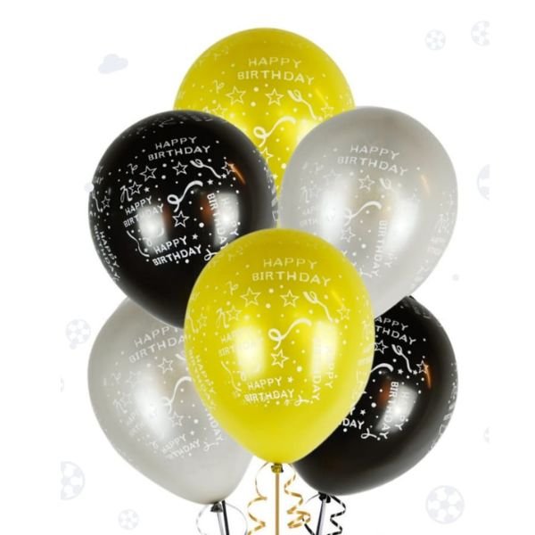 Item # AG57634 Material: latex Color: Gold/Silver/Black Each pack Includes: 6 pcs 12″ Solid Color Latex Balloon Printed Happy Birthday