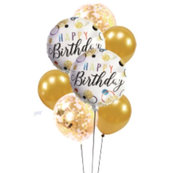 Item # AG13623 Material: Latex/Mylar Color: Gold / Confetti Balloon Each pack Includes: 2pc 18″ Happy Birthday Balloon 5pcs 12″ latex balloons